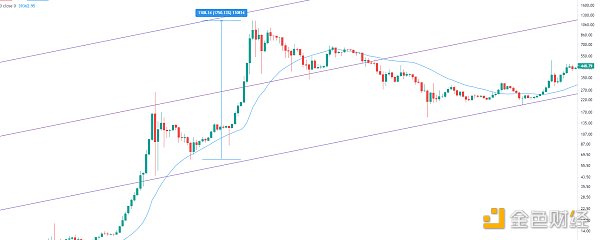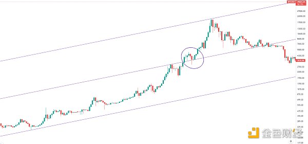 而目前盤面這個走勢,和之前走勢很相似,同樣消息面利空刺激,價格大幅下探,并且目前周線也是回踩該長期趨勢線,最低點刺破該趨勢線,不過周線收線收回的話不算有效跌破,所以兩者之間還是比較相似的。而在2017年的大牛市以及2013年的大牛市都是有效突破該趨勢線,后面便繼續牛市進程直至牛市終極大頂,所以該趨勢線的關鍵作用能夠看出來。所以目前判定牛市結束還早,不要過分看空,把籌碼扔在地板上。目前市場已經到了極度恐慌的階段,盲目殺跌不可取,就算真正熊市啟動,也有超跌反彈逢高出局的機會,何況現在還不能判定牛市結束。比特幣牛市進程中大幅調整是很常見,牛市不可能每個人都盈利,洗盤是主力必不可少的行為。