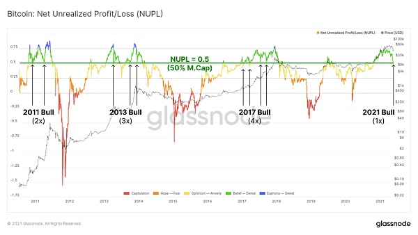 縱觀整個比特幣市場,未實現凈損益指標(NUPL)已回落至略低于0.5的水平,而這一水平在之前的三個牛市周期中都起到了支撐作用,這實際上是2021年市場的第一次觸底。
