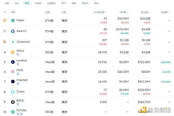 鎖倉量排名前十的借貸平臺 排名來源:DeFibox