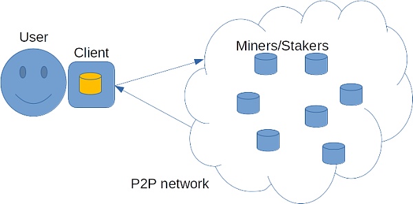 我先來總結一下上圖包括的組件。首先礦工 (或質押者) 生產區塊鏈。P2P (點對點) 網絡確保每個人都能夠使用有效的鏈,盡管存在一些不誠實節點 (你需要連接到至少一個誠實且連接良好的 P2P 節點,以確保自己始終與有效鏈保持同步)。最后,客戶端將交易發送至 P2P 網絡并從網絡中的其他節點接收最新的鏈更新 (或者是完整的鏈,如果它們正在同步的話)。客戶端實際上是網絡的一部分,它們也將通過轉發區塊和交易來做貢獻,但在這里不是那么重要。