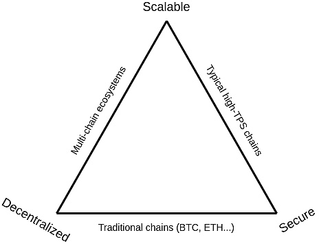 高TPS區塊鏈包含DPoS鏈,但也涵蓋許多其他區塊鏈。這種區塊鏈依賴于少量節點維持共識,數量通常介于10-100個,用戶必須信任大多數節點。根據上文的定義,該解決方案實現了擴展性和安全性,但沒有實現去中心化。