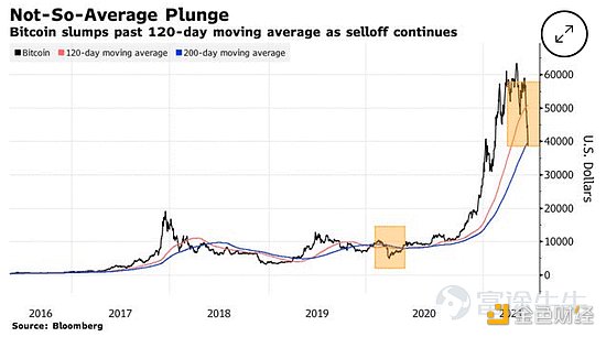 而今日內比特幣已經一度下探30000美元關口。彭博數據顯示,比特幣已經跌破120日移動均線。