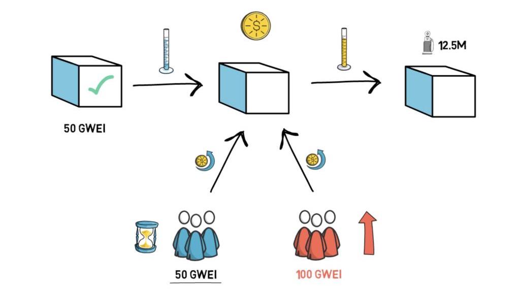 這種情況下,區塊上限為12.5Mgas,打包區塊的唯一方法是出價高于其他用戶。