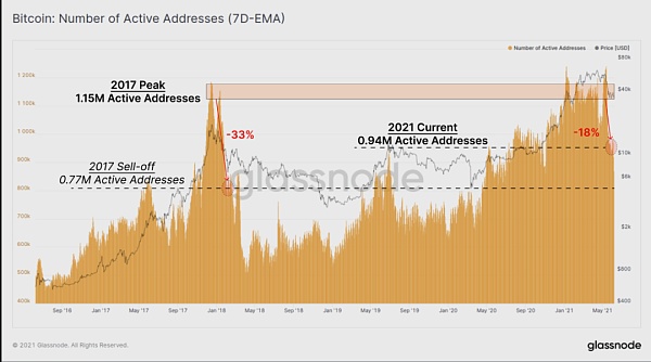 在最近的拋售中,比特幣網絡經歷了活躍地址的減少,從最近的高點下降了18%,大約為94萬。這一跌幅約為2017年跌幅的一半,表明雖然活動已經放緩,但比以前的周期宏觀頂部存在更多的需求。