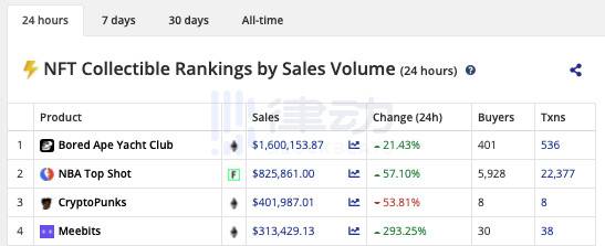 截至發稿時,Bored Ape Yacht Club 24 小時銷售額達 160 萬美元,幾乎是排名第二的 NBA Top Shot 的兩倍、CryptoPunks 的四倍。