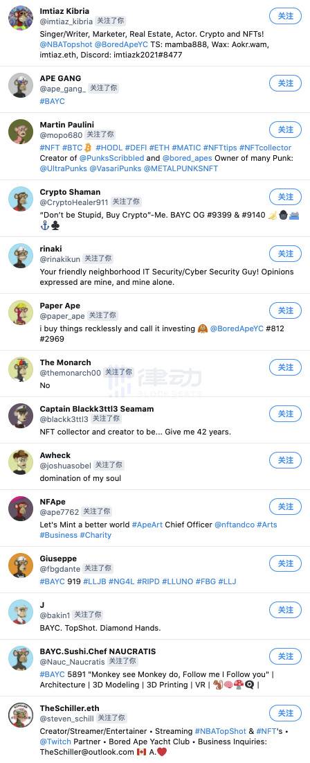 在此之前,你很難看到有這么一個 NFT 收藏品項目會讓上千人自發地將如此便宜的 NFT 用作自己的頭像,Bored Ape 不像 CryptoPunks 和 Hashmasks,后兩者由于其高昂的價格所以當人們將其用作頭像時實際上是被炫耀心理所推動;另一件你肯定也沒有見過的事情是,一些猿猴頭像的推特用戶會發推宣稱:「我會關注所有使用猿猴頭像的人。」,更有人甚至會將使用猿猴頭像的用戶全部羅列成一個清單供其他「猿猴」關注,于是當你把頭像換成一只 Bored Ape,過上一段時間后打開粉絲列表,便會見到如此光景。