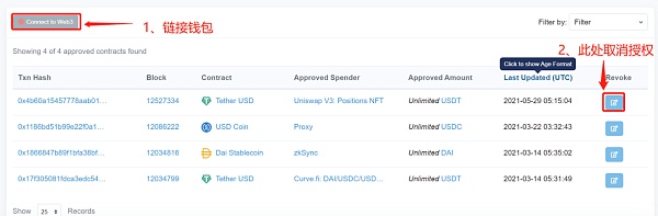 如果你要取消授權,你還需要連接錢包,點擊左上角“Connect to web3”登陸錢包,然后通過后方Revoke一欄來進行取消,取消也是需要支付一定的GAS,所以,如果是授權的知名項目方,或者你常使用的產品和代幣,我們可以不用取消,否則取消之后再次調用合約的話,會需要再額外支付一筆GAS。