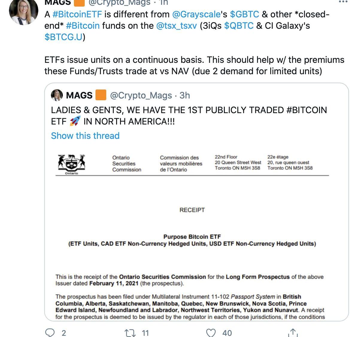該公司的招股說明書顯示,Purpose比特幣ETF將在多倫多證券交易所交易,其交易代碼為BTCC。該基金只用來購買比特幣,投資者可以用加元或美元購買比特幣。