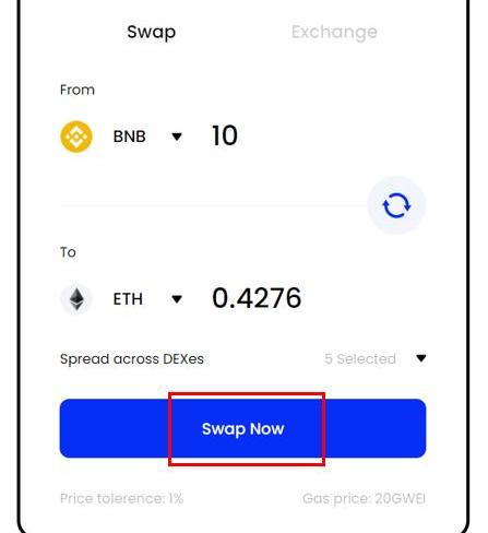 輸入要兌換的幣種和數量;平臺自動匹配最優價格:“FindingBestPrices”,等待一會,點擊“SwapNow”;
