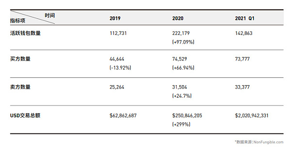 NFT 市場逐年呈倍數級增長, 2019 年到 2020年, USD 交易總額從 6286 萬美元上漲到 2.5 億美元,增長近三倍。2021 年 NFT 受益于 DeFi 生態取得繁榮發展,據 NoFungible 數據顯示(不包含NBA Top Shots 、Nifty Gateway 等項目數據),僅第一季度?NFT 市場交易額便已超過 2020 年全年 8 倍,約為 20 億美元,。