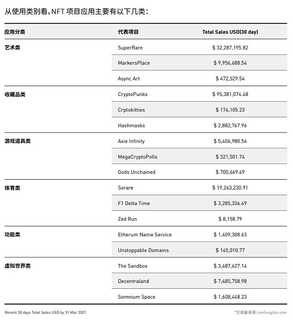 從使用類別看,NFT 項目應用主要有以下幾類: