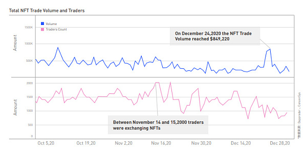 DeFi 是 2020 年加密貨幣市場熱度板塊之一,該板塊總市值于 2020 年 9 月 1 日達到 160.42 億美元,在 Sushiswap 創始人被爆套現多個項目接連暴雷影響下,其總市值快速下跌,短時回落至 2020 年 8 月初水平。DeFi 降溫期間,以 MEME 為首的 NFT 市場快速崛起,日交易總量自 9 月 17 日開始不斷攀升,并于同月 27 日達至年內最高點 54 萬美元,藝術平臺 SuperRare 和 NFT 交易平臺 OpenSea 月成交量亦在彼時各創歷史新高,分別錄得?77.7 萬美金及?275 萬美元。
