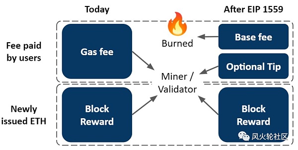 現在礦工的收益是區塊獎勵+用戶支付的Gas手續費,1559之后區塊獎勵不變,用戶支付的gas變為兩個部分,一個是base基礎費,一個是礦工小費,其中基礎費部分是直接銷毀的。