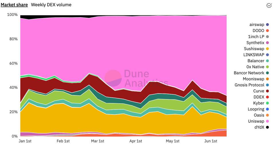 但你猜怎么著?Uniswap 仍然是 DEX 領域的主導力量,沒有其他協議能夠接近其產生的交易量和費用,這從其 60% 以上的市場占有率以及年初至今三位數的增長率可見一斑。