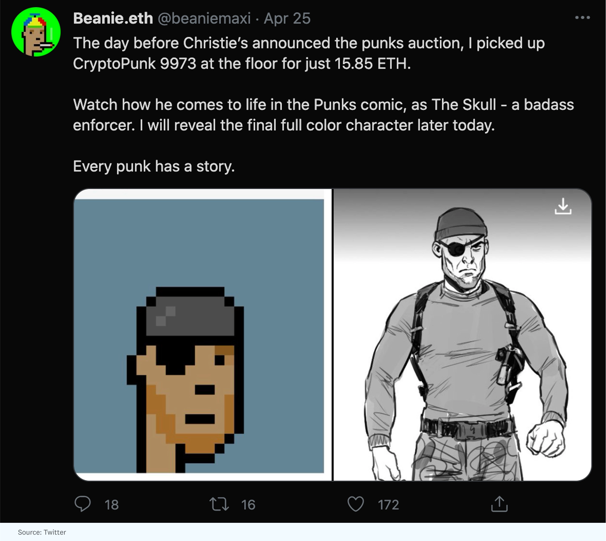 不過,收藏家們不僅僅是被動地持有Punk,他們也開始相互合作,創造出受CryptoPunk人物藝術啟發的故事,讓他們的Punk "活起來"。NFT藝術作為數字樂高積木的功能,或一種創造性的干細胞--無論哪種方式,都為肥沃的想象力提供了基礎,以各種方向和方式發展。例如,一群收藏家創建了一個以16個Punk為主角的PUNKS漫畫,并配有背景故事和敘事弧線,將為這些Punk創造完整的角色身份。