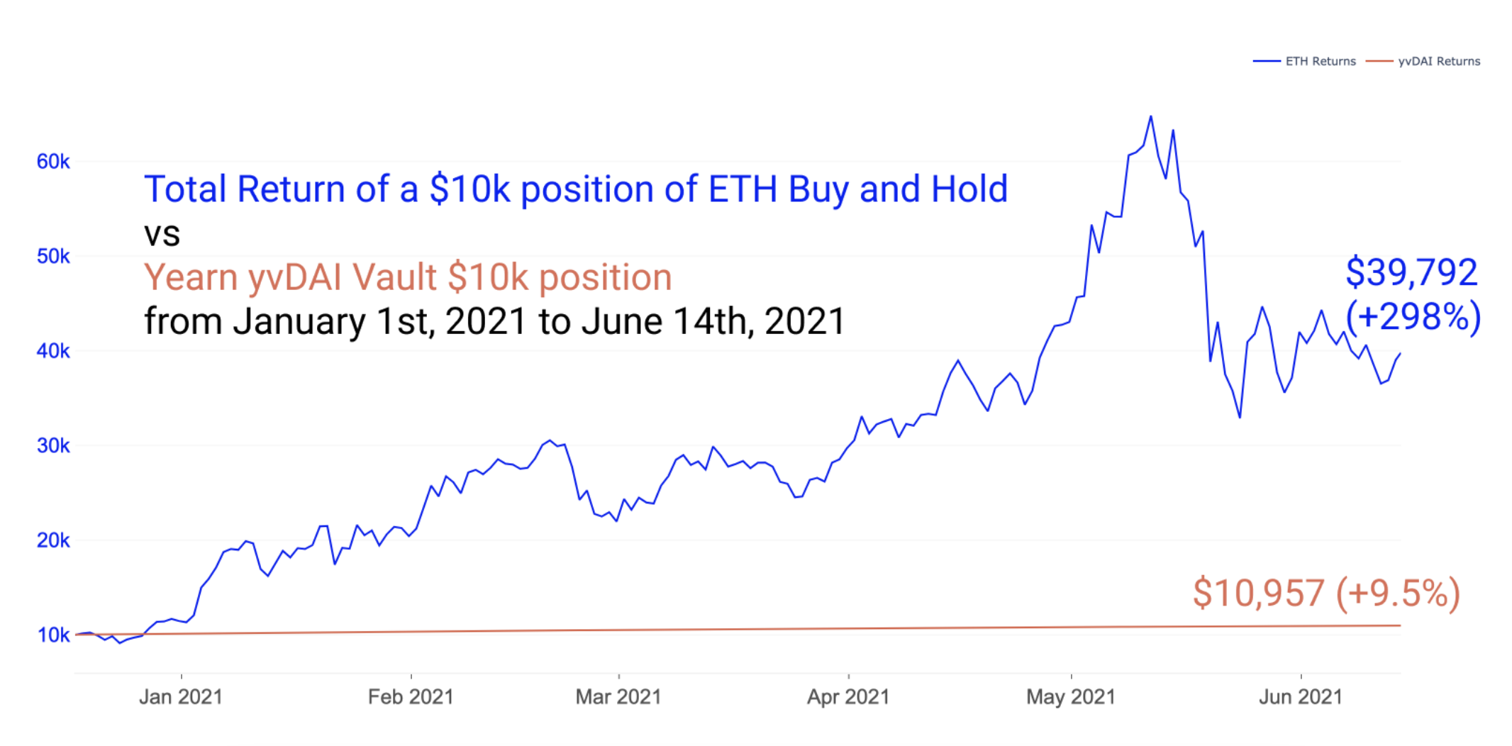 話雖如此,穩定幣策略在各種特殊的時間范圍內表現都優于ETH。例如,自5月初以來,ETH買入并持有的表現明顯落后,而Yearn stables的APY徘徊在8-12%左右。這顯然與簡單持有現金的情況類似,但通過將現金存入Yearn,交易者在獲得收益的同時主要是在規避風險。