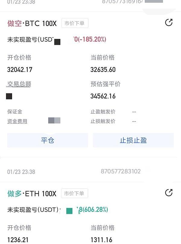 1月23日23:38,利用利潤再次開倉做多以太坊,同時做空比特幣進行對沖。
