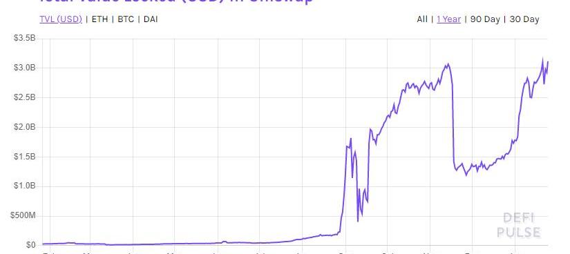 2020年3月,UniswapV2發布了,它在其前一版本之上做了很多重要的改進。主要改進包括:使用甲骨文提高了價格準確性,以幫助DEX能夠更好的抵抗操縱;提供了閃電互換,這對于希望利用DeFi進行套利的交易者非常有用。除了這兩點,UniswapV2還進行了一些小的改進,以提高效率和安全性。最重要的改進之一是開始實施去中心化自治組織,DAO為發布其代幣UNI鋪平了道路,UNI從2020年9月開始正式可以在交易所中交易。該代幣推動Uniswap鎖定了超過30億美元的平臺資金,使其成為DeFi中最大的項目之一。