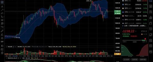 ??以太坊價格走勢再次與大餅聯動,日線級別昨日同樣收出一根帶長下影線陽K,早間價格沖高后再次回落,目前運行于1240附近。