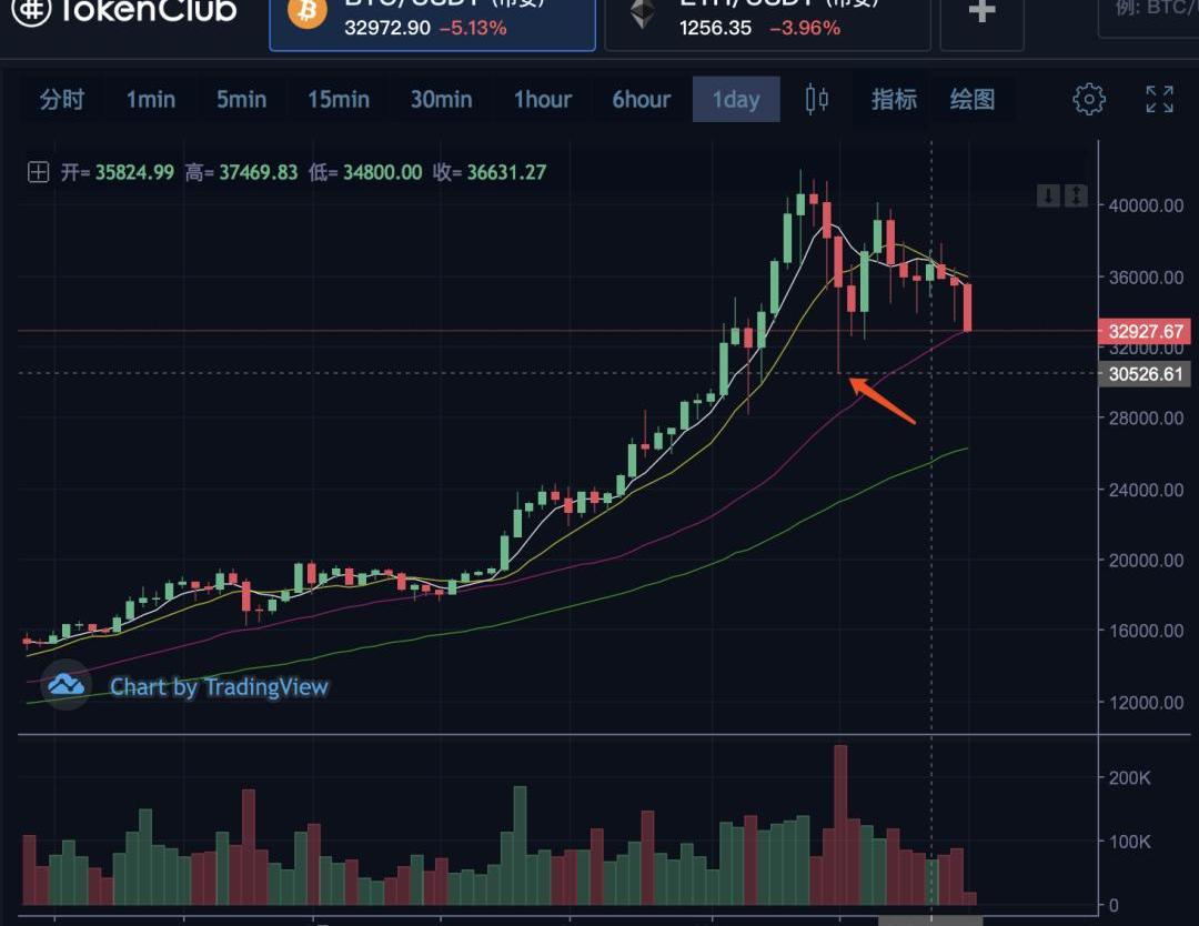 1900/1/1 0:00:00行情回顧:昨日比特幣單邊下跌,全天空頭主導市場,多頭毫無反抗之力,最低下探至30061美金。今日幣價延續跌勢,觸及28800美金后企穩回升,截至寫文當下,比特幣震蕩上行,現報31776美金.