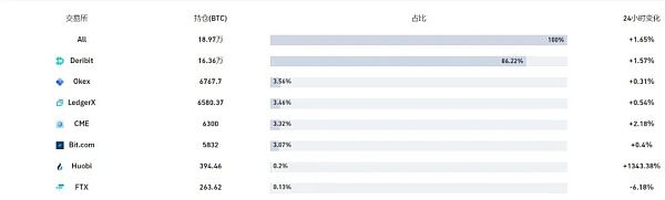 在期權市場占比方面,Deribit 擁有絕對的優勢,占據著近86%的BTC期權市場,92%的ETH期權市場,緊隨其后的分別是OKex、來自美國的LedgerX數字交易平臺以及芝交所CME。