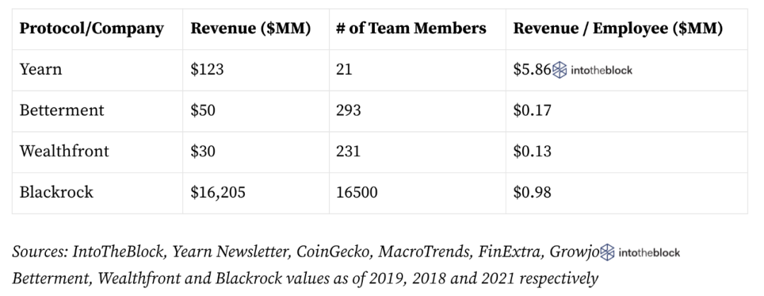 機槍池可以對標到現實世界中萬億規模的資產管理行業,Intotheblock的研究員Lucas Outumuro將yearn與機器人投顧的Betterment 、Wealthfront,以及傳統資管巨頭blackrock做了比較,認為yearn在投資收益率(收入/管理資產規模)方面有顯著優勢,估值(P/S)不高,而且單雇員收入更高