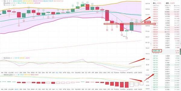 日線級別看,昨日行情大幅回落從原先的MA5均線上方位置跌至布林帶中軌附近位置后再走出反彈,目前的行情已經重新回到了MA10均線下方,技術面看,除MA5均線下行趨勢較為明顯其余各均線指標保持上行多頭趨勢明顯,附圖MACD多頭能量有持續縮量的跡象,快線DIF上行穿過慢線后上行趨勢有所放緩,KDJ三線更是已經死叉持續下行,那么從技術面看空頭氣氛十分濃重,但考慮到行情回踩主要目的就是洗盤和修復之前大漲所背離的技術指標,后續行情只要周K趨勢不變那么我們依然還是以多單為主要的思路,那么以太日線操作可以在985-975一段掛一個多單作為一個埋伏,考慮到現在的低點確實已經越來越高,那么下一波回踩低點必然也將會是在1000附近,操作小倉位進場注意靈活操作基本沒什么太大問題。