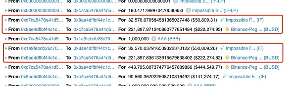 之后攻擊者通過 Router 傳入自定的兌換路徑 (AAA -> IF -> BUSD) 將 AAA 代幣兌換成 BUSD 代幣,而問題正是出現在此兌換過程中。通過鏈上記錄我們可以很容易的發現攻擊者在將 AAA 代幣兌換成 IF 代幣的過程中進行了兩次兌換操作: