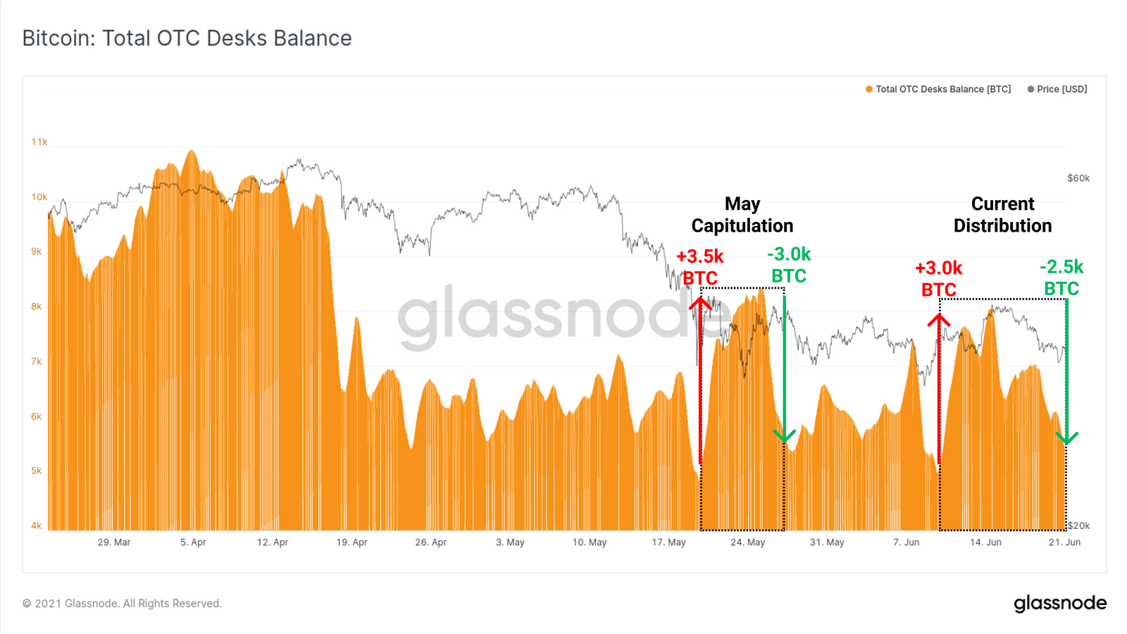 在5月份的拋售和過去兩周,Glassnode觀察到3000至3500 BTC的凈流入。然而,買家在短短幾周內幾乎吸收了全部流入量。總體而言,場外交易平臺上的比特幣持有量自4月份以來一直相對平穩。