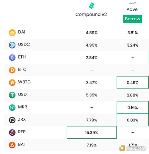 當然,對于借貸協議來說,最重要的一點就是 Borrowing interest rate 和 Lending interest rate,這兩個利率直接和借貸雙方的利益相關。所以,我們需要看一下 Aave 和 Compound 的利率,看看是否有很大差別,defirate 顯示二者主流借貸幣種 30 日平均數據如下: