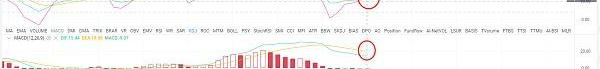 目前我們從小時級別圖可以看到,目前幣價經過一波拉升之后,已經到達了一個相對的高點。能明顯的看到上方壓力位是非常強勁的。另外馬上進入回調區間。日線也馬上要收線了。此時我們應順勢進場。幅圖KDJ三線也從超賣區走出。呈下拐發散運行狀態。所以我們現在的思路要以高位空單為主
