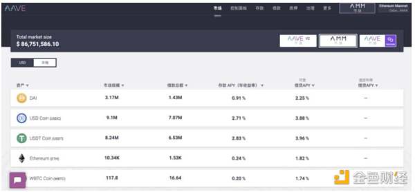 AAVE 是一款使用者眾多的以太坊借貸 dapp,存款人向市場提供流動性賺取收益,根據不同 token 產生的 APY 也不同。收益由借款人提供,資金使用率越高 APY 越高。目前穩定幣 APY2-3%。現階段大部分的借貸平臺都使用此類機制,平臺賺取存借款 APY 之間的差價和借貸清算費用。AAVE 出現時間較早,經過黑客考驗后仍然正常運營,存在風險較小,但收益也低。