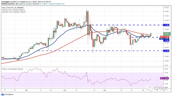 空頭未能將價格維持在33美元以下,吸引了買盤,多頭今天將價格推到了50日均線之上。SOL/USDT現在可能會反彈到41.75美元至44美元的上方阻力區。