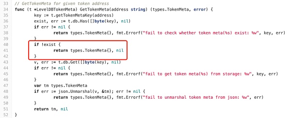 在 getAssetFromTokenAddress 方法里,我們看到它調用了 getTokenMeta 去獲取代幣元數據,此時也傳入了資產合約地址作為參數,但在此處有一個定義引起我們的警覺,在初始化代幣時,默認賦予了代幣符號為 ETH,這就是漏洞的關鍵點之一:asset := common.ETHAsset,如果傳入合約地址對應的代幣符號為 ETH,那么此處關于 symbol 的驗證將被繞過。