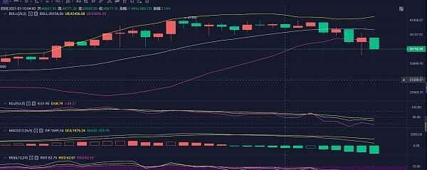 從四小時來看布林帶呈開口姿勢,幣價已經跌破下軌支撐線并且還在不斷向下試探,KDJ三線仍呈死叉運行三線的值均在50下方且還呈下降的趨勢;MACD快慢線雖然還在0軸上方運行,但卻開始向0軸靠攏;RSI三線拐頭向下發散空頭市場逐漸加強。綜合來看空頭市場強烈短期還有跌破的可能,抄底風險較大,可回暖做短空。