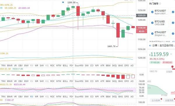 ??ETH:昨日晚間兩點半左右行情再次上拉,后續半小時再次一波強勢回調近130多點,目前小時圖大陽收線收在斐波那竊61.8上方,回調插針修復在61.8上方一個多小時時間,也正好說明了多頭動能有多強,短期需要一波回踩蓄力,大級日線KDJ三線已經進入超賣區,受消息面影響停留,RSI三線向下發散,綜合目前點位,白盤操作可以先來一波空單入場,上方重點關注1185位置,也是空單入場比較好的點位
