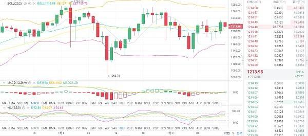 ????以太坊一小時圖中,布林帶呈張口形式,K線在布林帶下軌上方震蕩運行,均線系統偏向下行,MACD快慢線在0軸上方放量運行,量能柱有縮量跡象,KDJ三線粘合交叉,RSI指標目前正常運行,整體趨勢偏下行,午間操作上建議還是以低多為主。