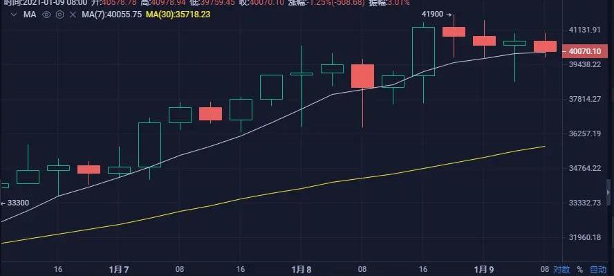 日線級別來看,比特幣昨日收陽,行情在試探下方MA5一線,但并未試探成功而是反彈上行,再次創下新高到達41900附近,之后今日開盤持續回落,白盤大概率和昨天走陰跌,依舊關注MA5一線支撐情況。