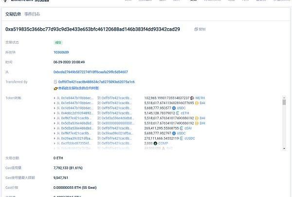 2.使用步驟1中得到的代幣,在Compound中借貸cETH、cDAI和cUSDC,也就是對三種代幣(cETH、cDAI和cUSDC)進行鑄幣操作(mint),量為5,150,226.00337039cETH,264,123,046.64278978cDAI,272,429,456.68851376cUSDC。