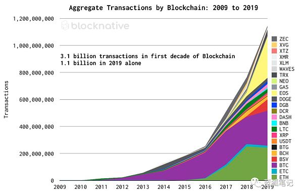 (從2009到2019年區塊鏈的匯總交易,來源:Blocknative,CoinMetrics)
