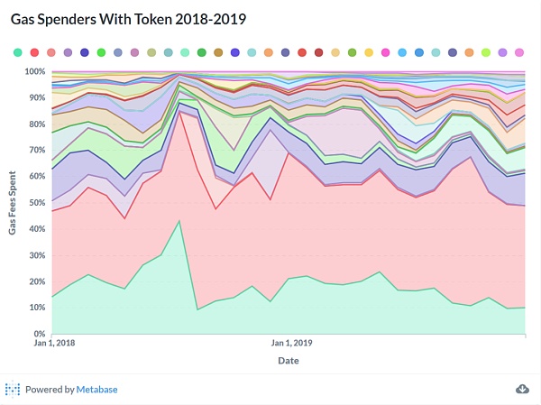 除了實體之外,我還在數據圖表中匯總了代幣合約消耗的總 gas,這一組一直占以太坊鏈上交易活動的 10% 左右。2018 年的許多合約都是龐氏騙局和賭博游戲,其中很大一部分來自中國。以 LastWinner 為例,這個游戲基于一個簡單的機制:用戶將 ETH 存入合約中,直到達到某個 ETH 上限。最后一個存入 ETH 的人將贏得池里全部 ETH。大家可以查看 2018 年年中的活動高峰期。