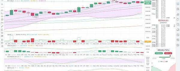 ????????四小時線看,布林帶開口擴大向上運行,早間幣價在10日均線附近獲得支撐走出反彈,一根大陽拉升突破布林帶上軌后,沿布林帶上軌再度刷新高點37680附近后幣價維持高位震蕩的走勢,下午跌破5日均線后多頭情緒強烈迅速反彈。附圖指標中,MACD快慢線在0軸上方延續金叉走勢向上發散,綠色量柱持續縮量,StochRSI指標嚴重超買在超買區有拐頭向下發散的跡象,SKDJ指標拐頭向下粘合。