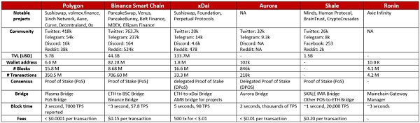 側鏈是獨立的區塊鏈,有自己的共識機制和安全屬性,與以太坊(主鏈)兼容。側鏈可以通過橋梁與以太坊溝通,這樣資產就可以在鏈之間轉移。在現有的側鏈解決方案中,就每秒鐘的交易(TPS)數量而言,Polygon(7000 TPS)和Skale(20000 TPS)的都有優異的表現。同樣,我們可以看到,Polygon的gas費用最便宜,每筆交易<0.0001美元。
