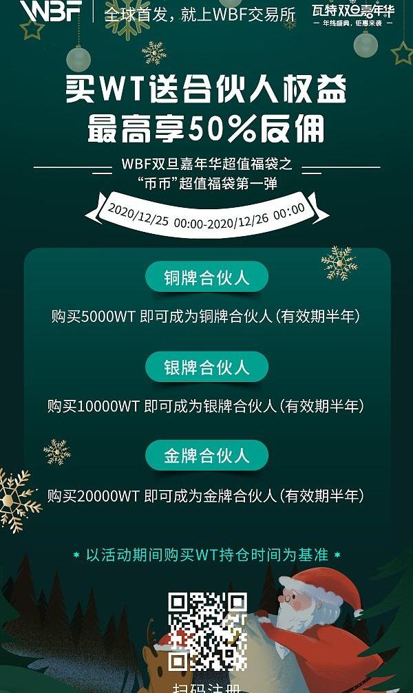 除“交易奪寶”“瓜分好禮”以外,2020年12月25日00:00-2020年12月26日00:00,凡購買WT數額達標的用戶還有長達半年合伙人權益免費領,最高50%返傭,助力用戶駛入財富增長快車道!