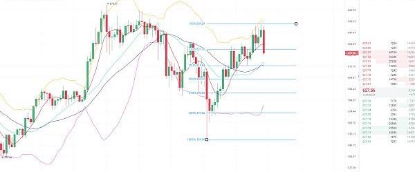 四小時級別上看,價格打破攻擊線支撐不斷上探,測試布林上軌的壓制力度,于656位置承壓下行,目前回測防守線支撐。布林通道開口,攻擊線與防守線均偏向上行,附圖指標向下放量,價格有下行的意圖,近日價格不斷上探,低點也在不斷上移,整體還是一個多頭趨勢,操作建議回調多單為主,上方關注667-670一線壓制,下方關注620-628一線支撐