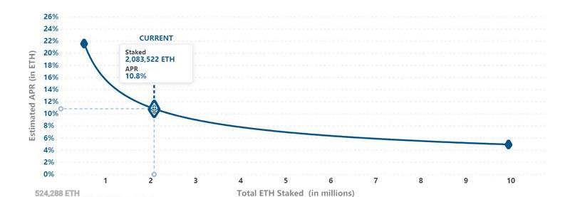 當質押的ETH數量達到524,288個時,信標鏈正式激活。截至12月28日,存款合約中的ETH總數已經超過208萬個,并且數量仍在持續增長中。用戶將ETH存入存款合約,也就完成抵押。同時,作為回報,用戶將獲得一定比例的利息收益。