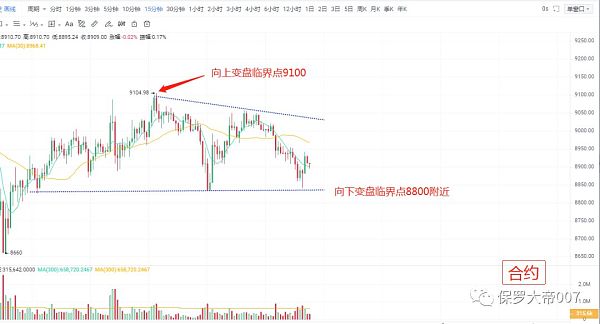 今日操作:第一壓力位9000,第二壓力位9300,第一支撐位8600,第二支撐位8300。合約方面,(如下圖)BTC15分鐘突破站穩9100向上可短多,跌破三角整理下軌8800附近可短空。