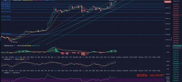 4小時走勢圖來看,大餅今日再創歷史新高25045,并且幣價上行通道已打開,這波行情沖高是在國外投資機構休息期間創下的,說明目前的行情極大可能是由市場上的散戶主導,而節后各方機構的回歸,或再次引領行情創出歷史新高。現各級別均線都呈一個上揚的姿態,MACD快慢線呈金叉縮口狀,綠色動能放亮縮減。KDJ三線處于上方85軸的位置處于一個粘合平緩運行的姿態。CCI線運行于超買區下拐運行,并未突破進入常態區。綜上所述,市場目前還是多軍占據主導,短期整盤修復,會有小幅回調,操作上建議多單入場,或者回調多,回調補倉多。