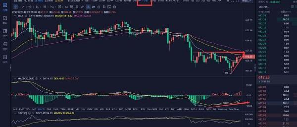 今天以太坊走的有點極端,白盤弱勢下跌,隨后晚間反彈上漲。早盤再次觸及602附近企穩反彈,12:15反彈到高點615附近承壓下行,開啟午盤下跌模式,直到16:30低點觸及588一線,午盤走出了近27個點跌幅,但觸底588后反彈,一路上漲,20:00高點上探到613上方。這波反彈也走出了25個點漲幅,幾乎收回白盤的跌幅,走了個深V反轉行情。
