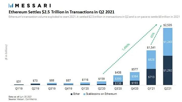 2021 年二季度,以太坊網絡結算的交易量達到了2.5 萬億美元,相比于今年一季度增加了 65%,比 2020 年二季度增加了 1490%!見下圖: